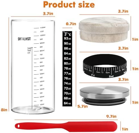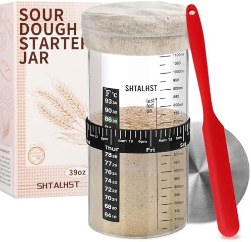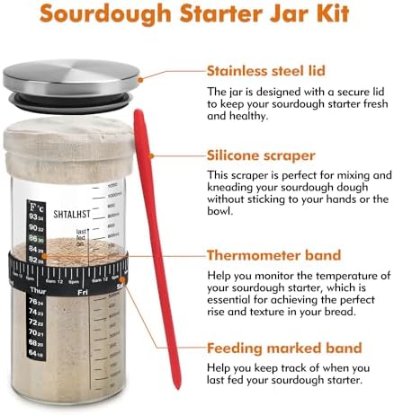 Sourdough Starter Jar Kit-1100ml/39Oz, Sourdough Starter Kit, Sour Dough Starter Jar With Stainless Steel Lid, Thermometer, Silicone Scraper, Cloth Cover And Date Marked Feeding Band (1 Pack)